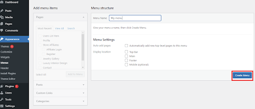 First, go to Appearance > Menus on your dashboard. On the Menus page, type the name of your menu in the menu box depending on your preference. And then click on the “Create Menu” button.